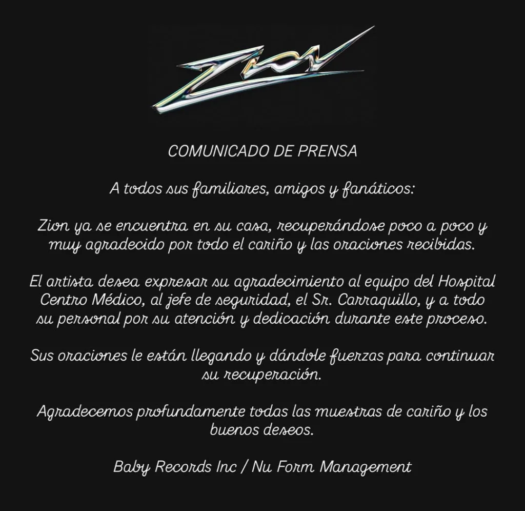 “Sus oraciones le están llegando y dándole fuerzas para continuar su recuperación”, aseguraron en el comunicado. Además, el equipo de manejo resaltó su gratitud por todas las muestras de cariño y los buenos deseos que Zion ha recibido, lo que ha sido fundamental para su ánimo en esta etapa.